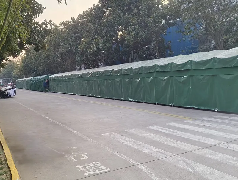 大型绿色移动伸缩仓库大篷以 “灵活伸缩、强效防护、工业级适配” 为核心优势,是工业厂区户外空间利用的优良解决方案,广泛应用于机械制造、物流、基建等领域,为企业打造效率高、安全的大型临时仓储与作业空间。