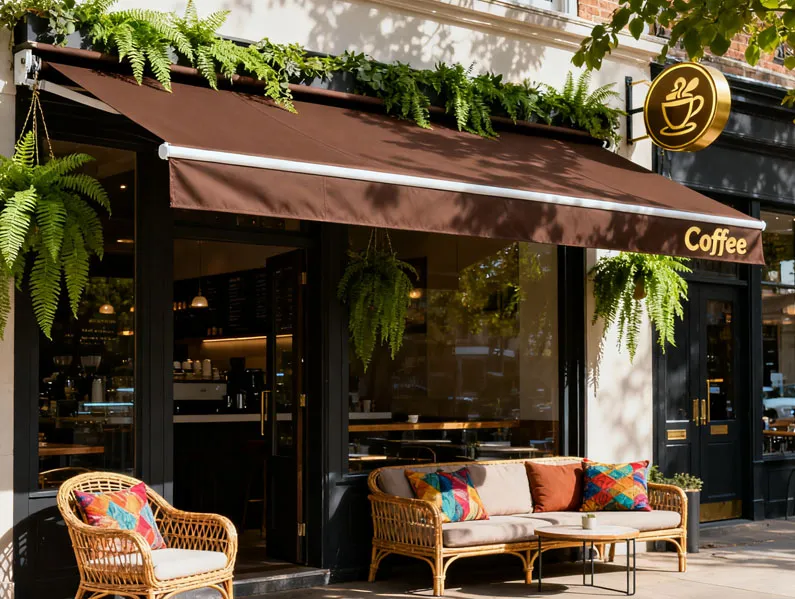 装饰性:深棕色篷面与门店黑色框架、藤编家具及绿植搭配协调,营造出自然温馨的商业氛围,增强场景吸引力。